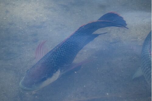 干潟に流れ込んだ水路からの水が溜まる場所にいた、大きな黒い魚。背びれの先などが赤い。 2021.06.12
