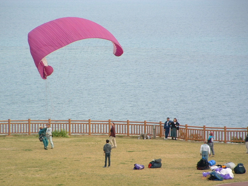 にて。パラグライダーに興じる人々。